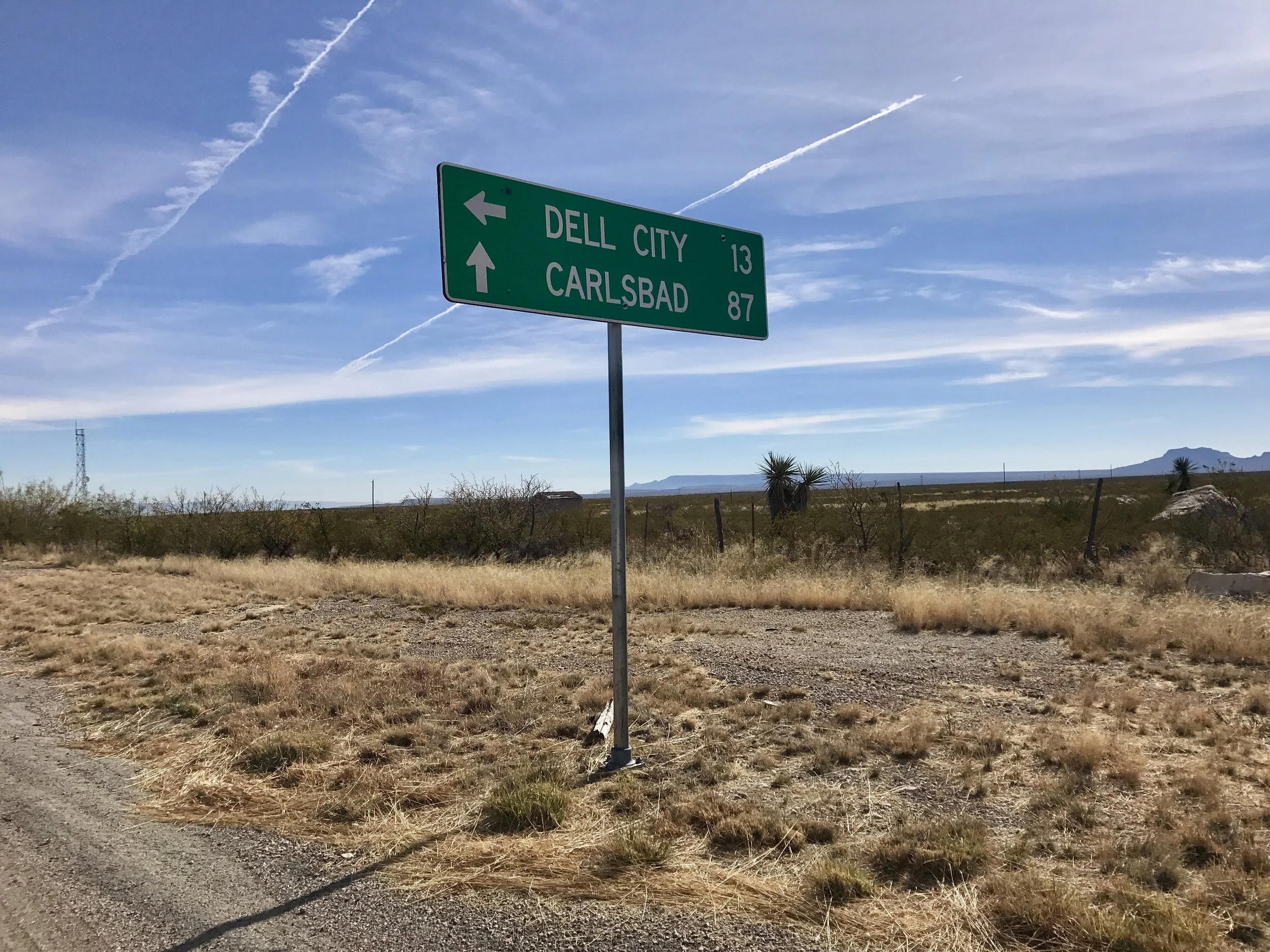 Half way between El Paso and Carlsbad NM you will see the cut off sign for Dell City.