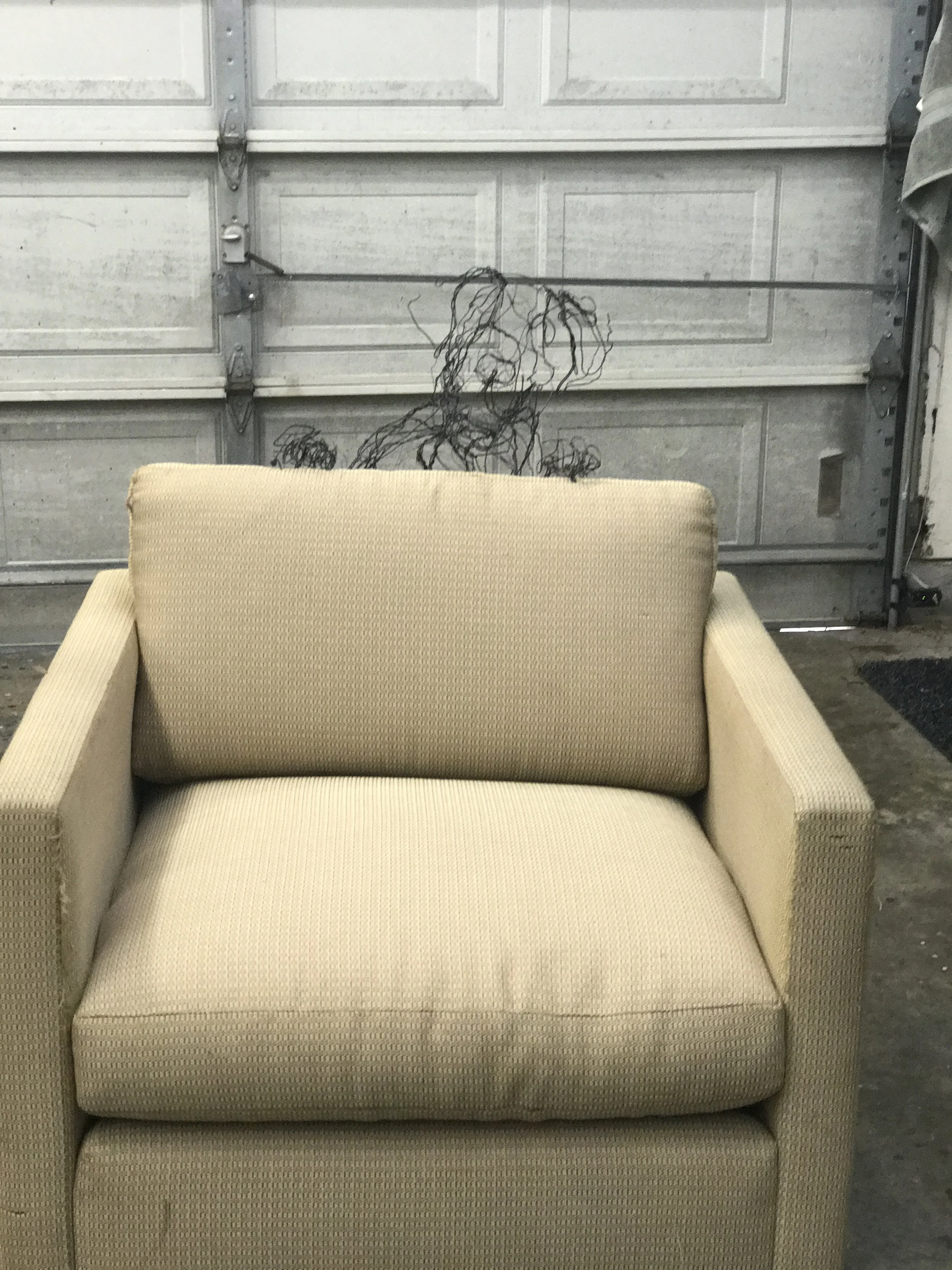 I started to scope out the junk/antique stores in Montrose. I wanted a club chair, with clean simple lines. Basically, a pedestal that looks like a chair. It had to be the right height, with a simple texture, and needed to be wide enough that a dog would need to pull up on it to see over and around, looking for his ball. This is what I found.
