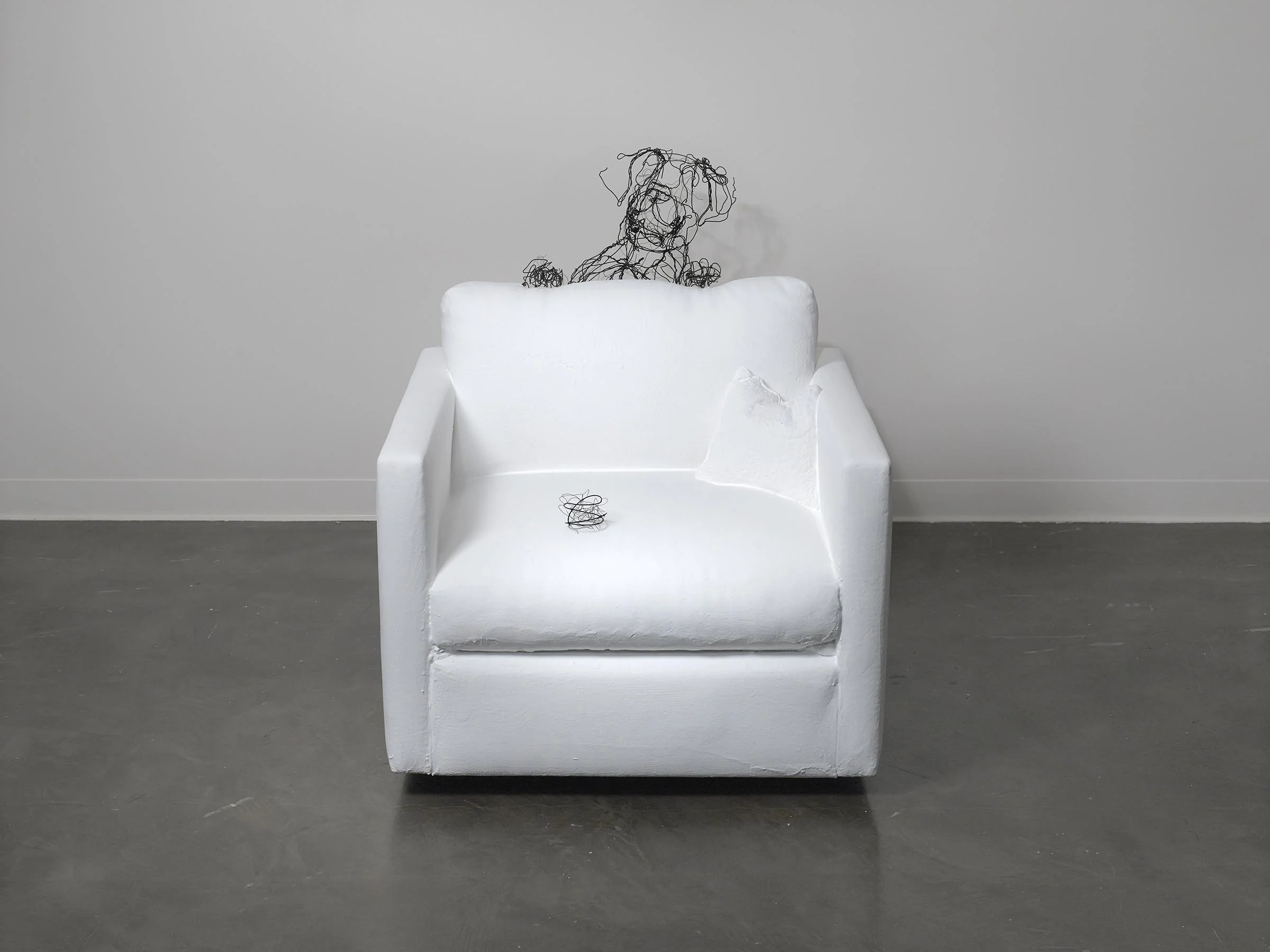 First, I took a very strong needle and sewed down the back cushion, as if the dog's weight was holding it down, right where his paws would rest. The next step was creating the finish. It took over a gallon of paint to make it look like a pedestal/sculpture. Sally was concerned that people might try to sit on it. As a result, I attached the dog's wire ball to the seat and I also added a pillow in the corner.