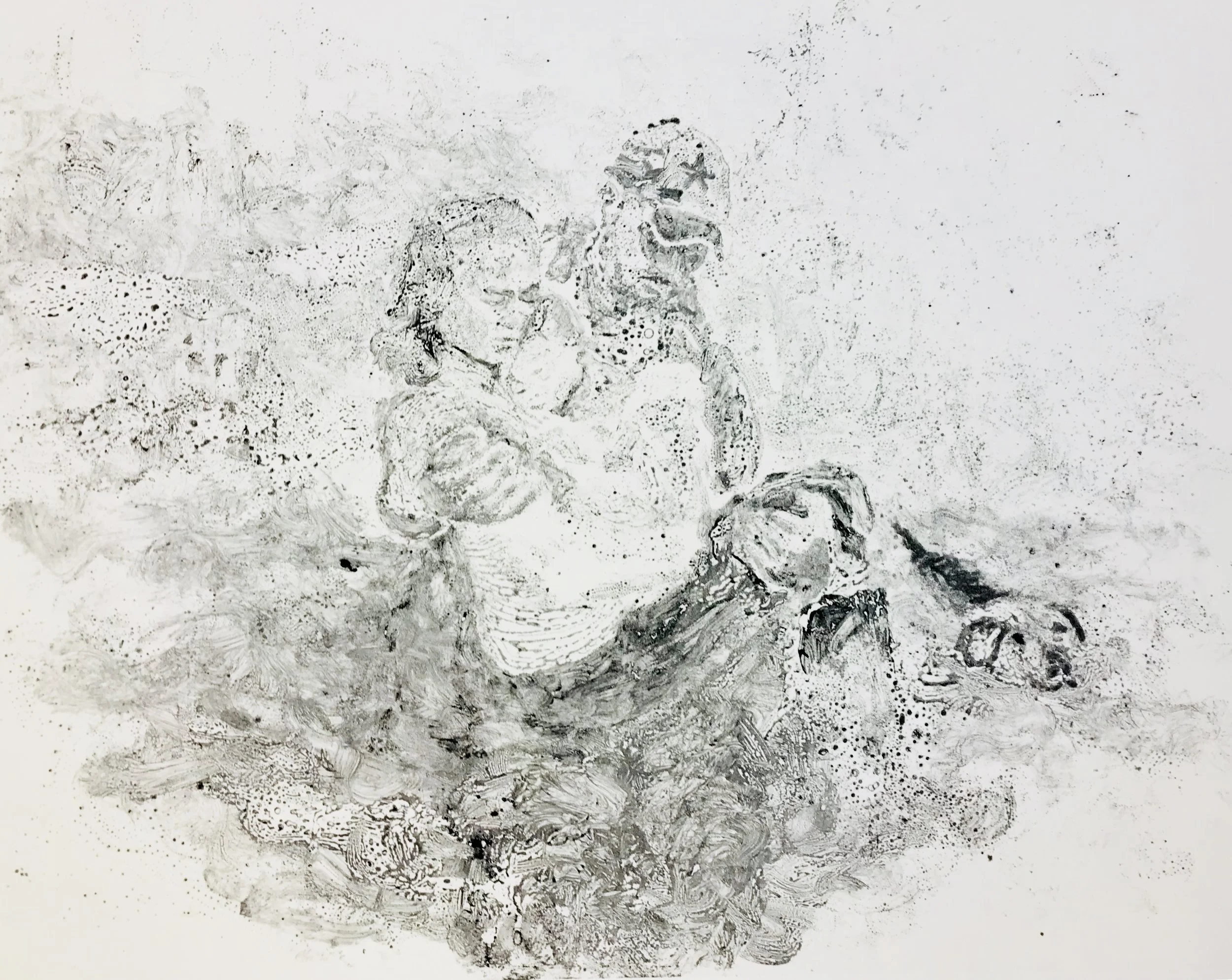 Within weeks I made two watercolor monotype pieces of the cot one as I saw it and one with a pet waiting for it’s owner. I was pleased with their crispness and the delicate watery shapes seen when closely inspected. It occurs to me that the cot was so symbolic to me because of the constant eyewitness news reporting and abundance of social media post. From my dry den I too experienced Harvey.