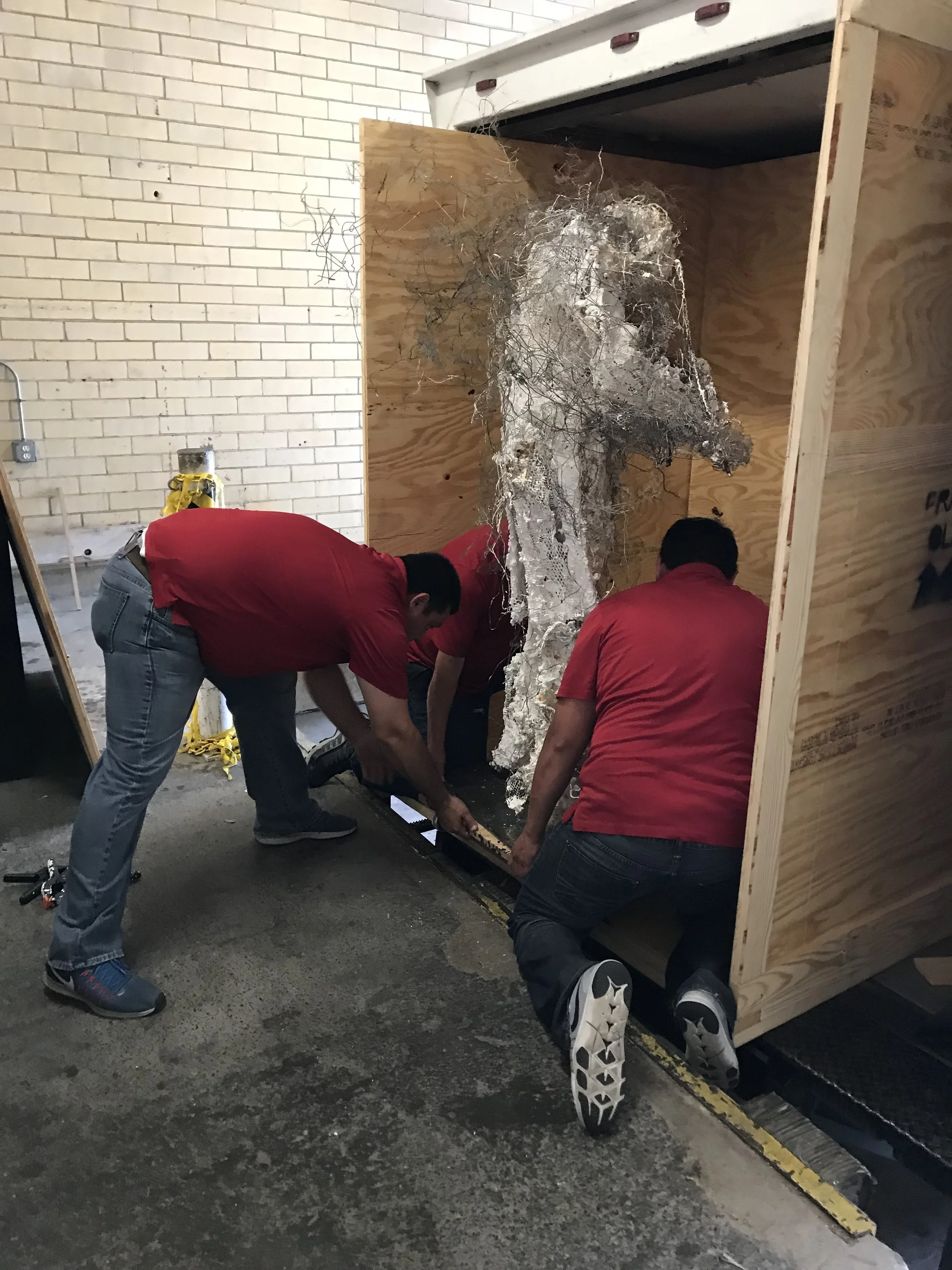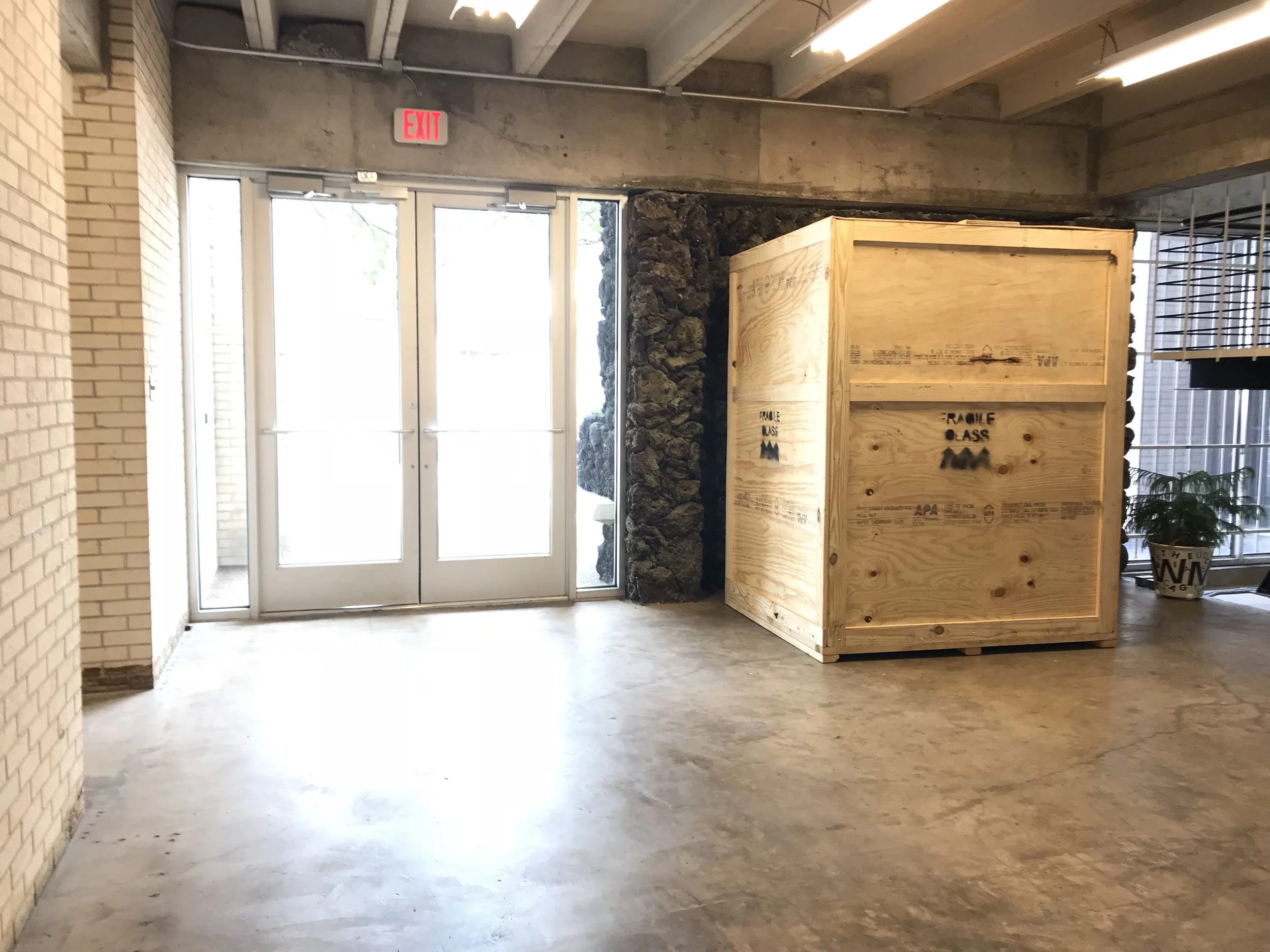 The crate waits In the lobby of my new building, Bermac Arts on San Jacinto until my space is ready.