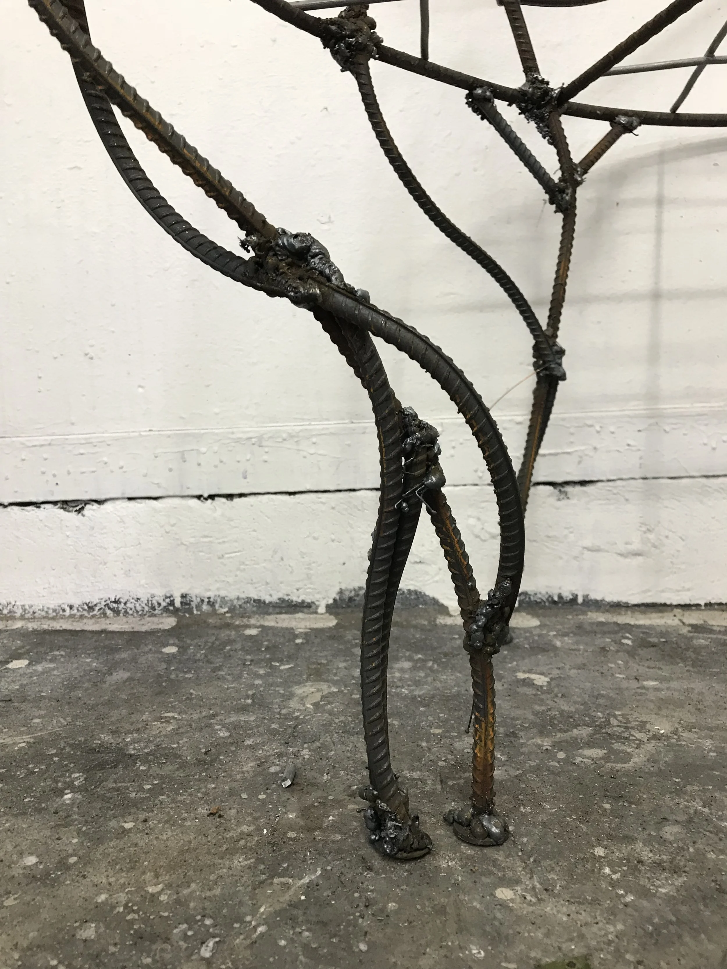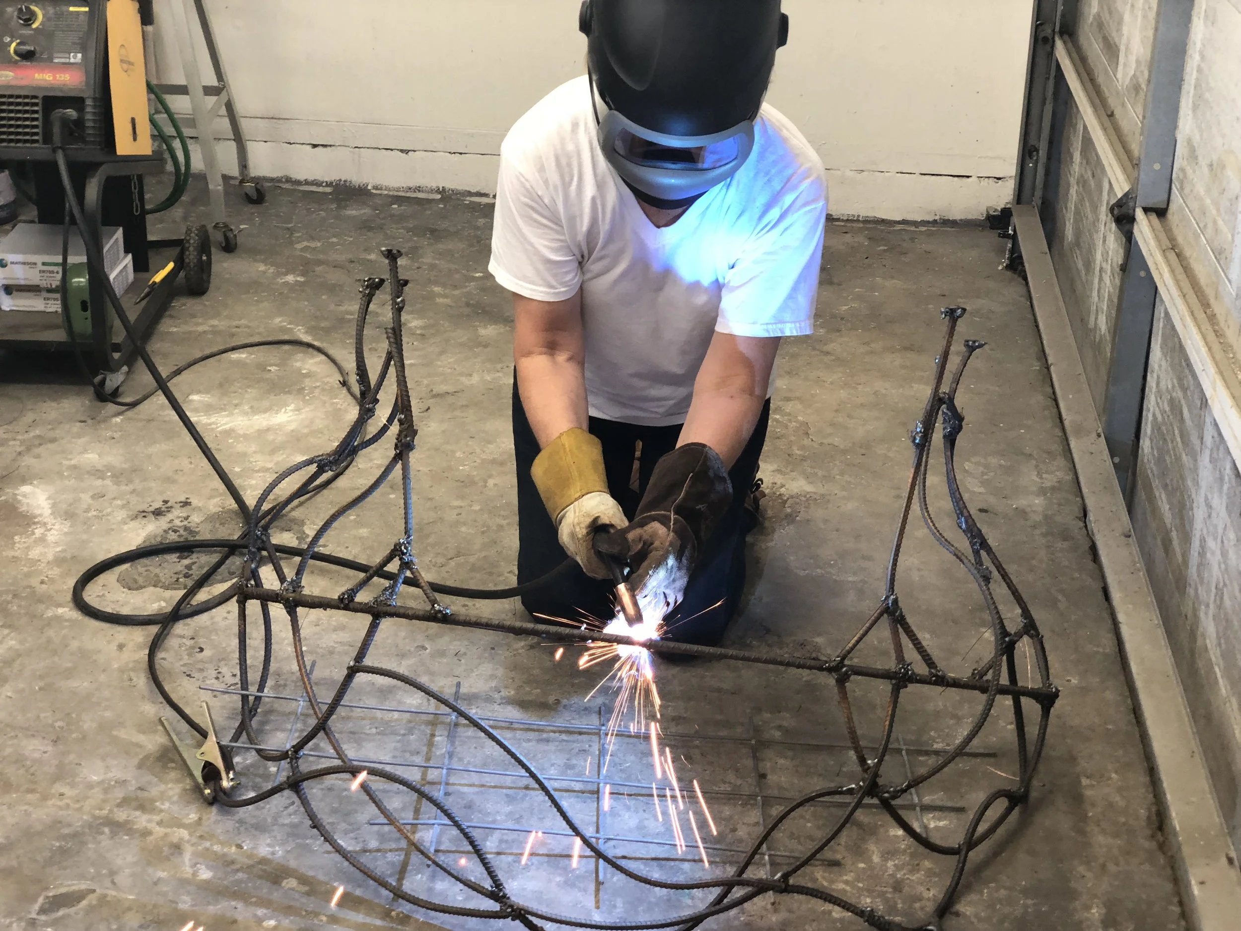 I have decide to double up on the front piece of rebar. Above I am tacking it to the first piece of rebar. (Thank you Sage for taking the pic.)