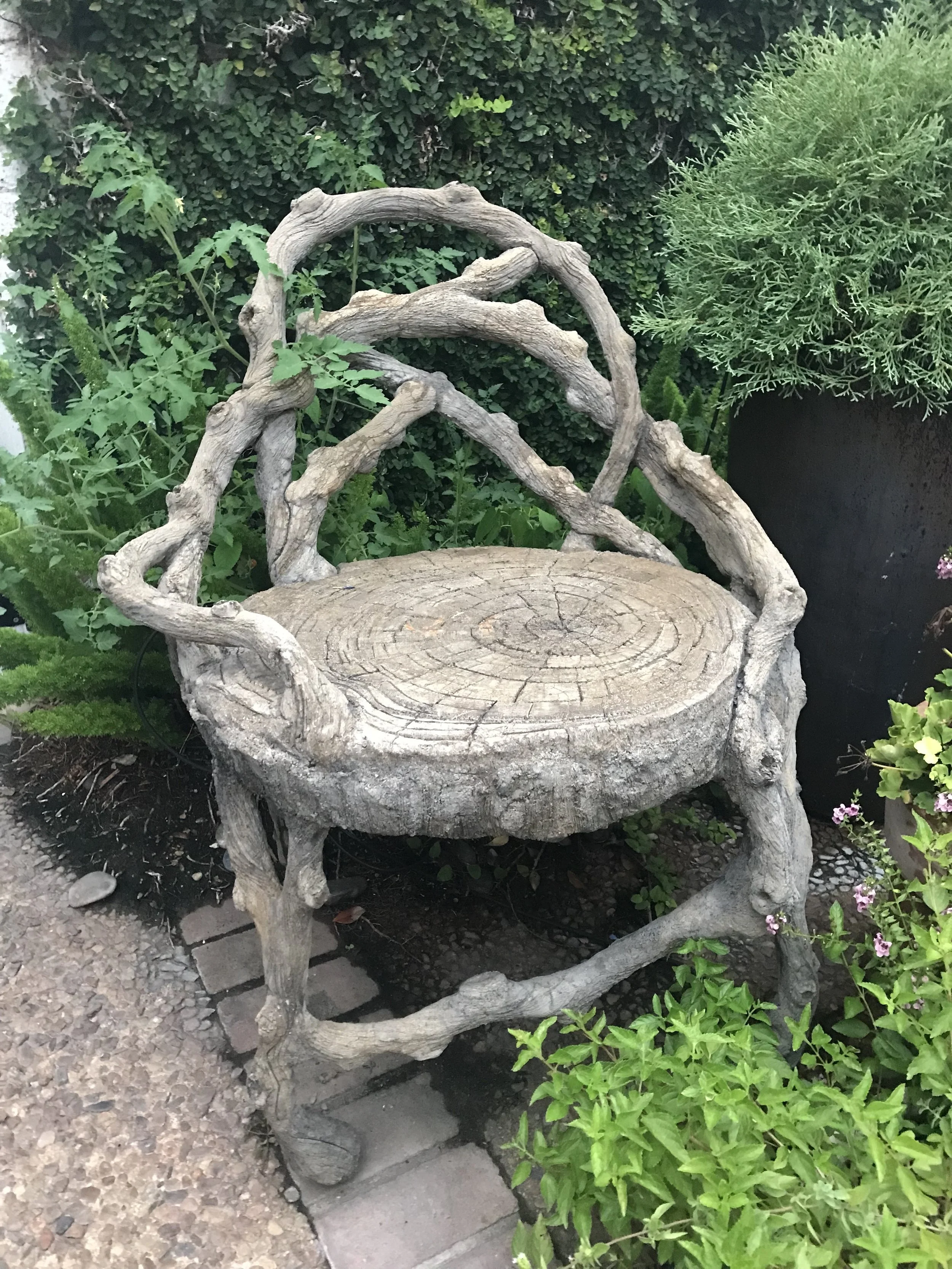 Here is a chair I did several years ago. The Concrete the lovebird bench will have a similar narliness with a much lighter patina.