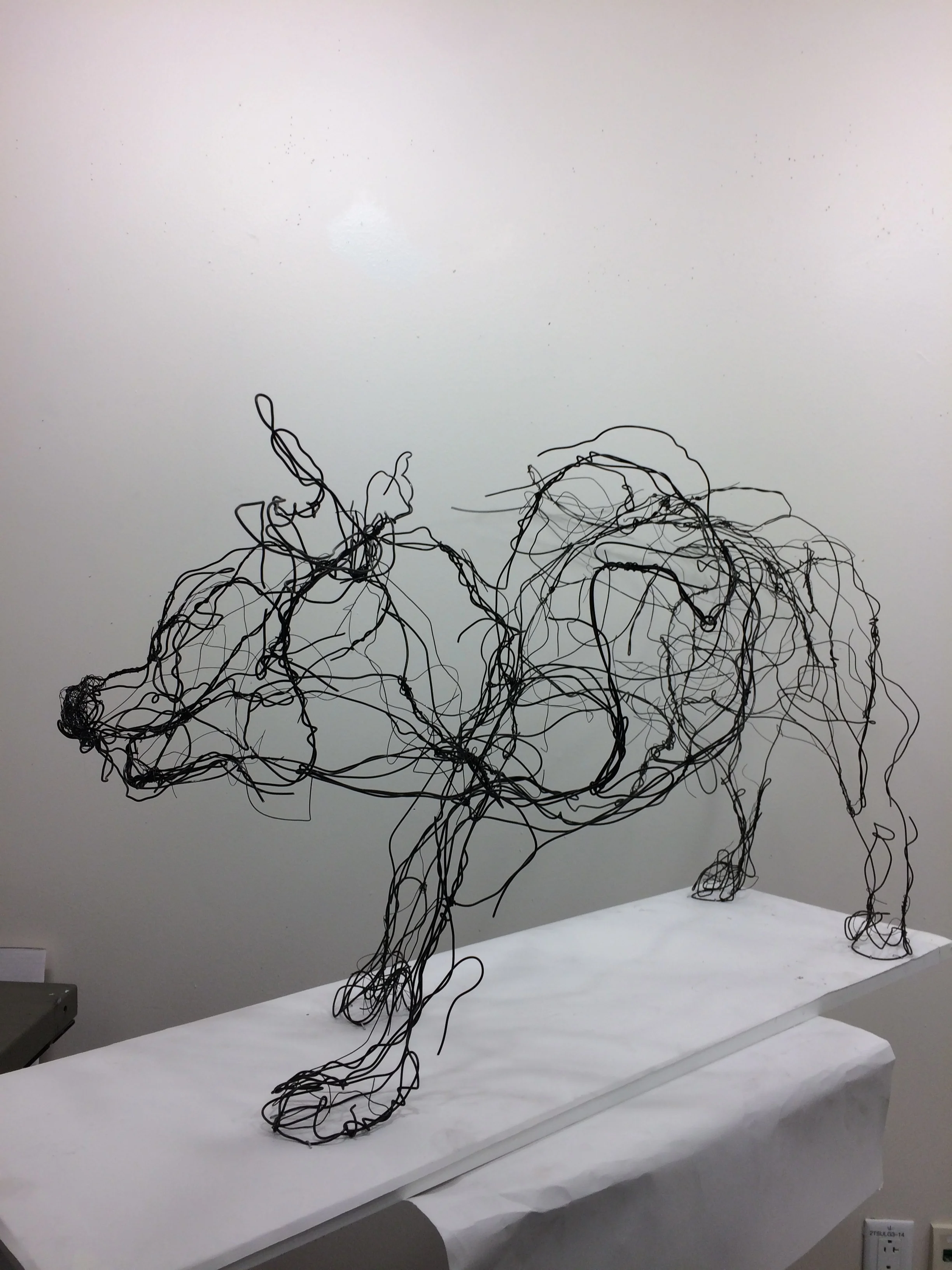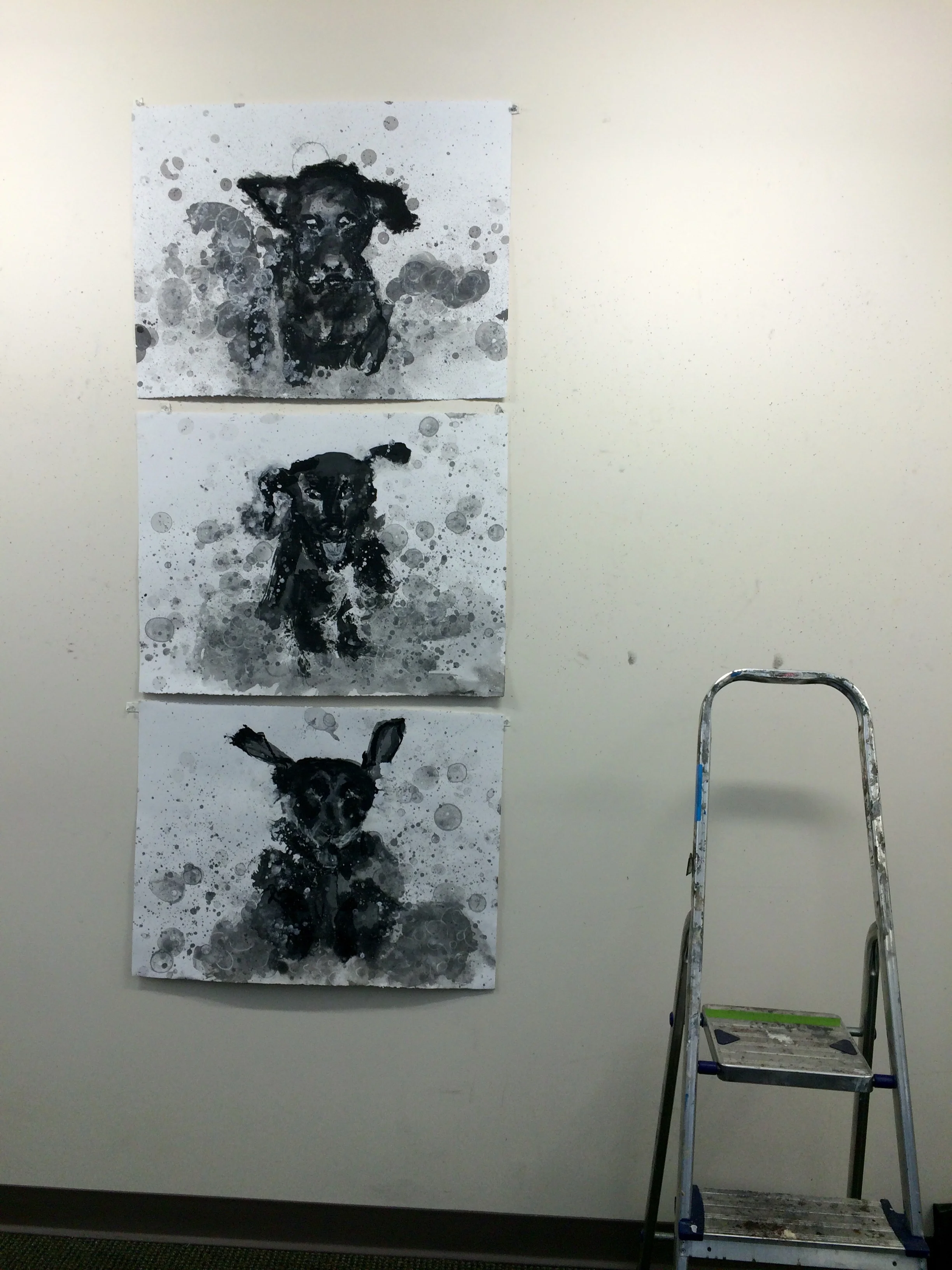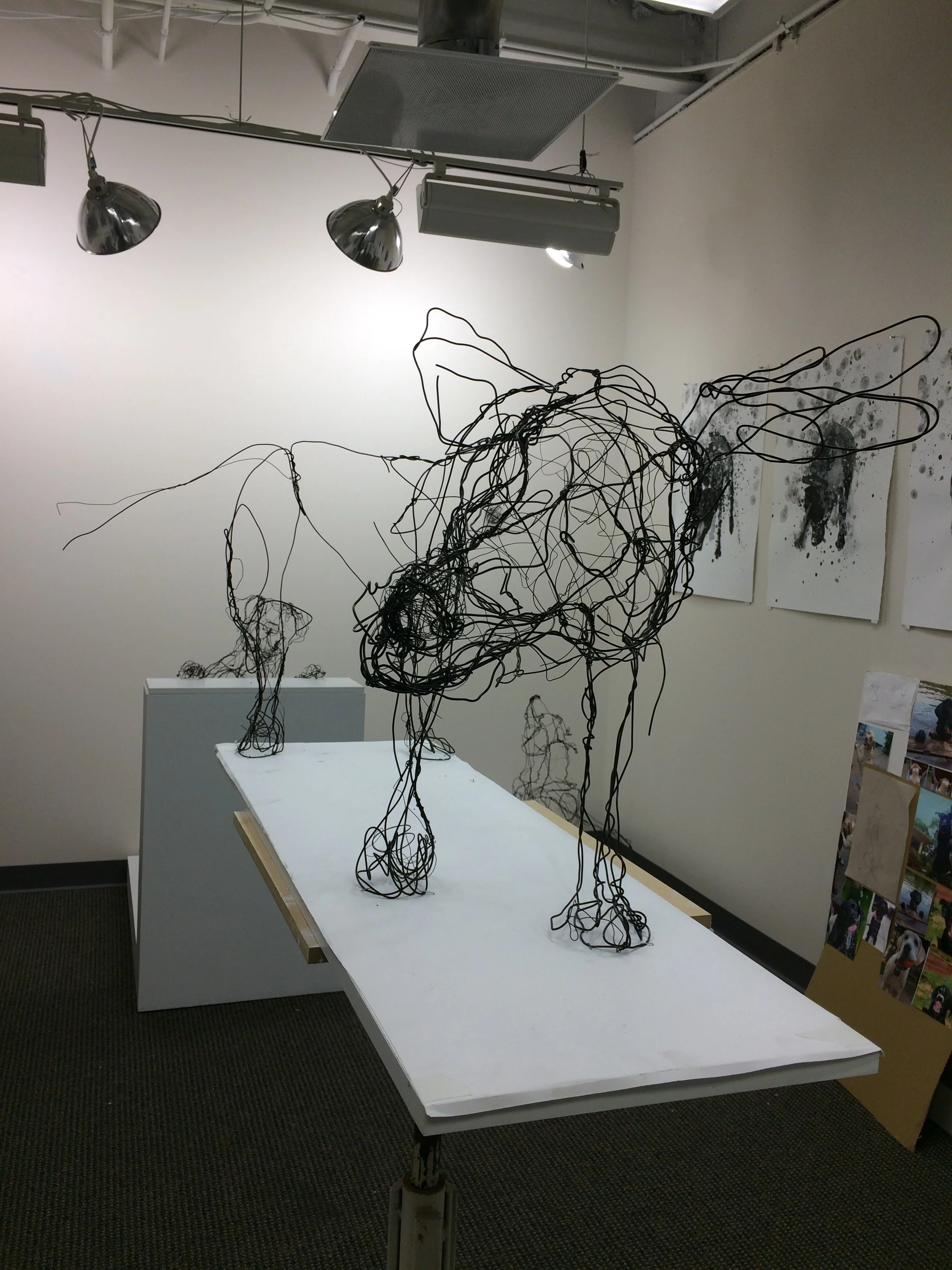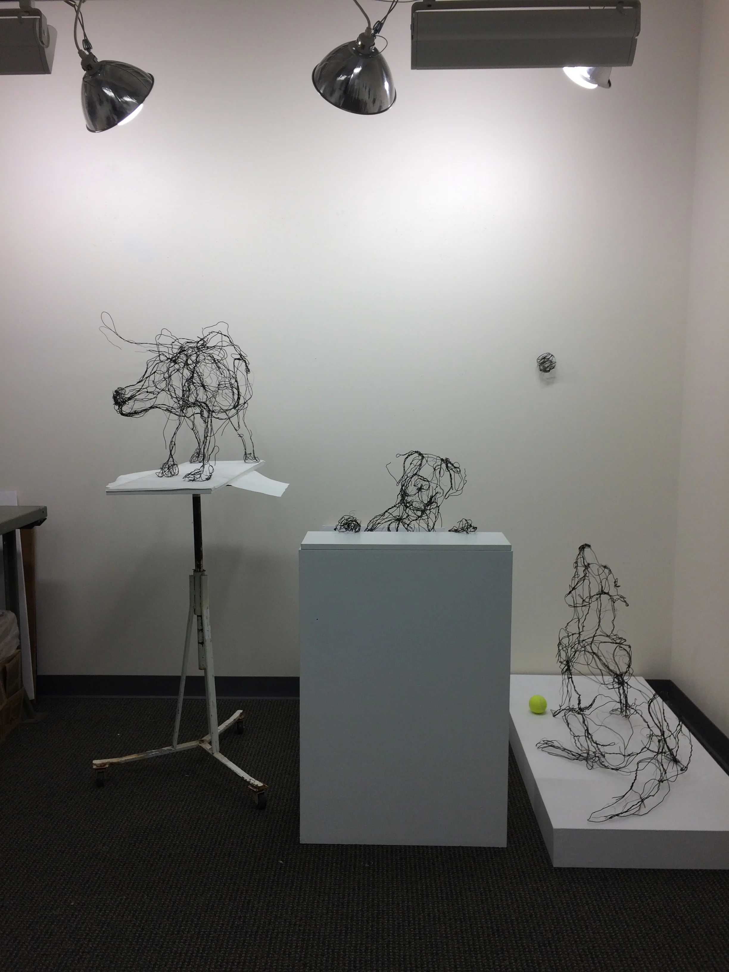 Easter of 2015 - grateful to have both kids in town we decided to go to the Buffalo Bayou Dog Park - all of us. My son Griffin took a slow mo video of our elderly Labrador Kitty. Kitty loved the dog park and would retrieve tennis balls from the pond like she was a two-year-old pup. She would consistently drop the ball at your feet and as you would bend over to pick it up shake all the water off her coat right on to all those standing near by. My son’s video inspired my “shake shake shake” series. In the drawings I used bubbles to express not only the action but the joy. The next challenge was to capture the same magical moment in 3D with wire sculptures. I have completed two sculptures and I have 3 more in my head. Then I felt the need to capture the dogs intense hyper focus on the ball before he is released to chase it down so I made "sit". "Sit " is on exhibit at MFAH Glassell studio school Interspace Gallery in the 2016 student juried show. This series of sculptures and drawings seems to continually lead to more work. I completed 6 - 50" X 60" drawings I call "fetch". The fetch pieces are more about the water as the dogs splash through water to get their balls. These pieces are all about ears and splashing. Still I feel I need 1 more piece to complete the story. The past 3+ weeks I have been working on another wire sculpture "jump". My goal is to capture that moment when time seems to freeze for a split second, the energy is calm and focused before the big splash landing in a lake. The point of view is from in the water and below the dog. Here is my drawing of "jump".