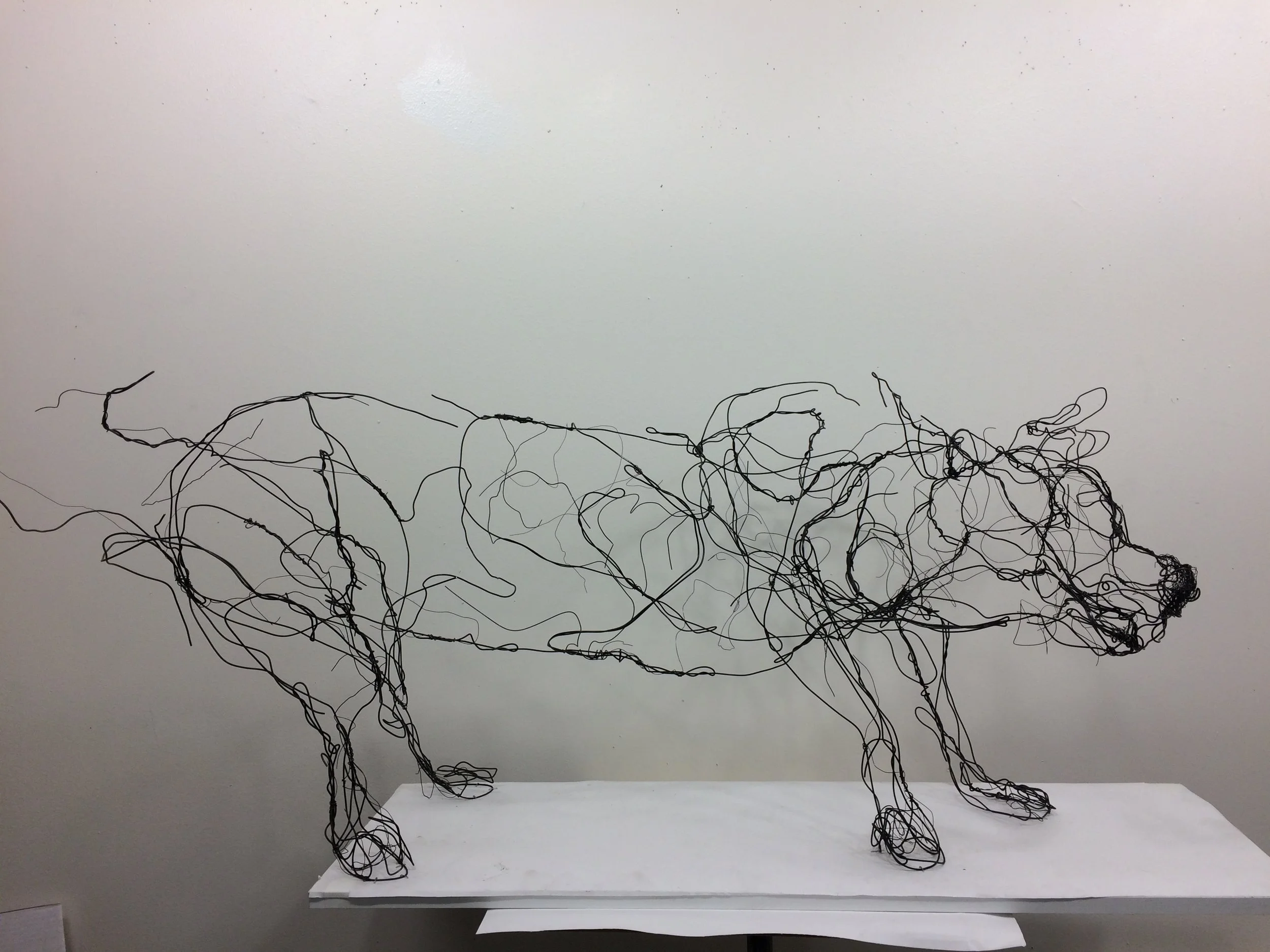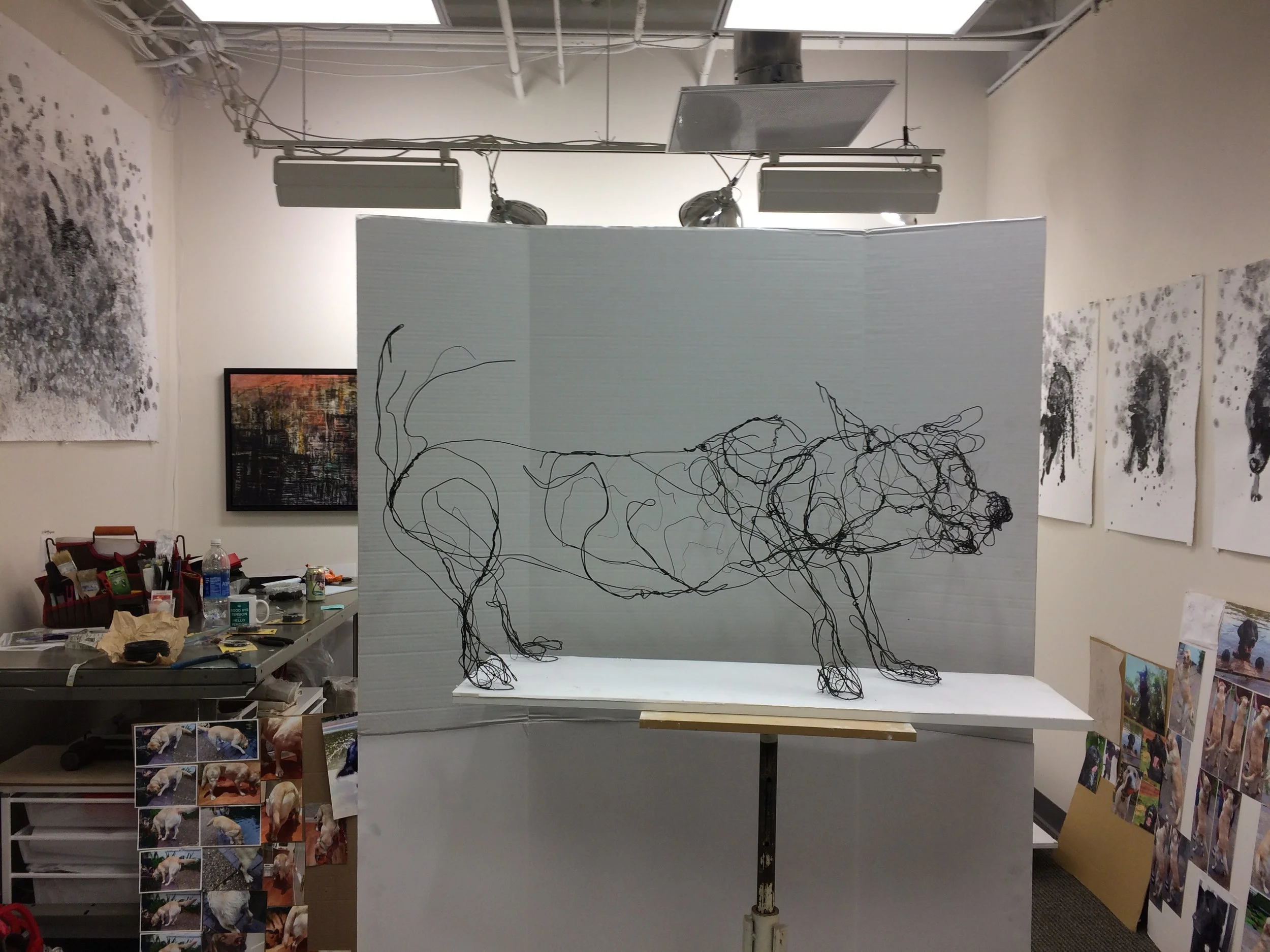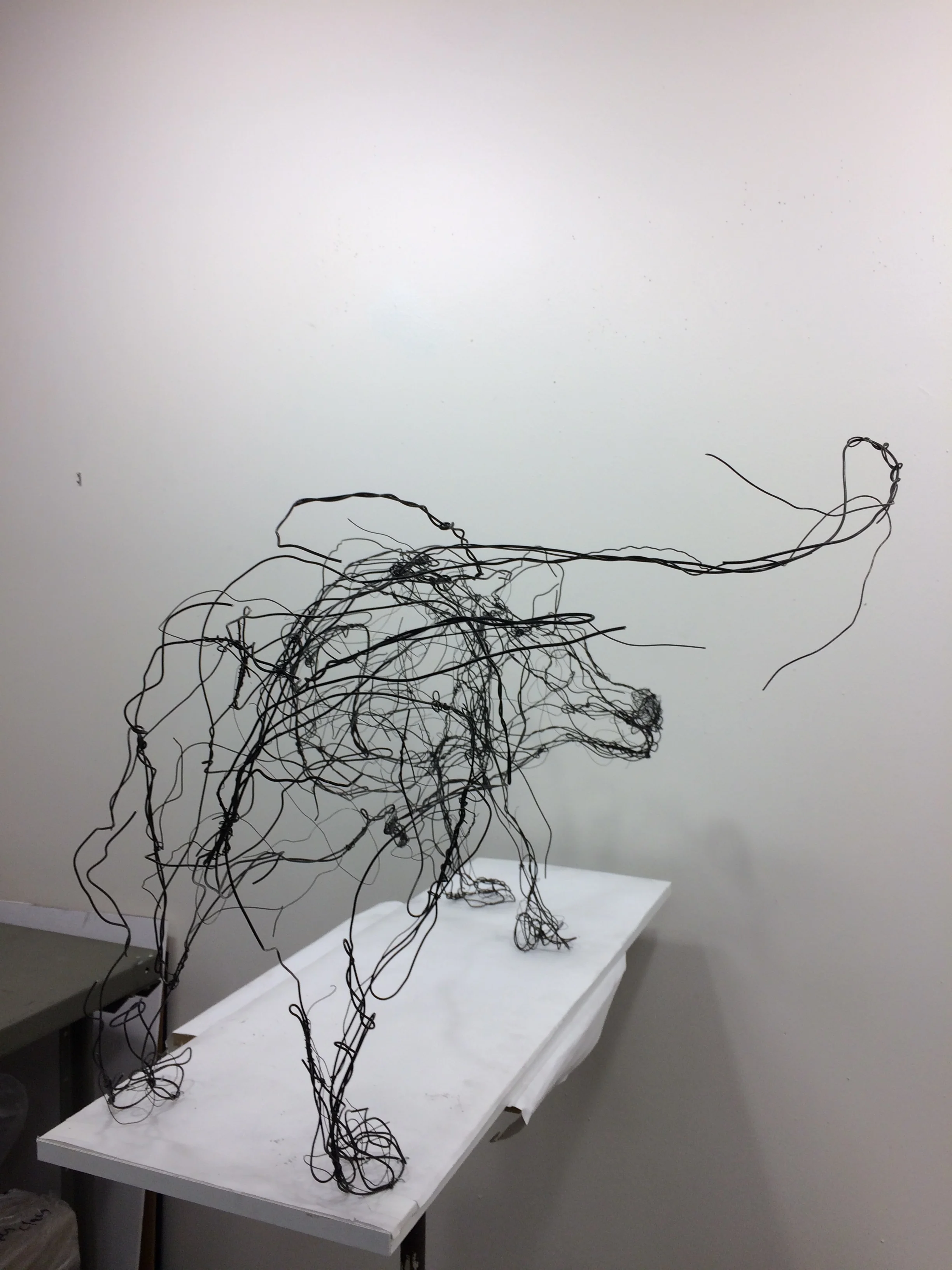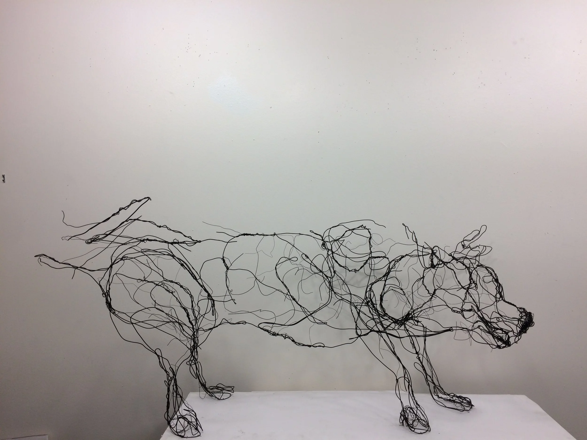Easter of 2015 - grateful to have both kids in town we decided to go to the Buffalo Bayou Dog Park - all of us. My son Griffin took a slow mo video of our elderly Labrador Kitty. Kitty loved the dog park and would retrieve tennis balls from the pond like she was a two-year-old pup. She would consistently drop the ball at your feet and as you would bend over to pick it up shake all the water off her coat right on to all those standing near by. My son’s video inspired my “shake shake shake” series. In the drawings I used bubbles to express not only the action but the joy. The next challenge was to capture the same magical moment in 3D with wire sculptures. I have completed two sculptures and I have 3 more in my head. Then I felt the need to capture the dogs intense hyper focus on the ball before he is released to chase it down so I made "sit". "Sit " is on exhibit at MFAH Glassell studio school Interspace Gallery in the 2016 student juried show. This series of sculptures and drawings seems to continually lead to more work. I completed 6 - 50" X 60" drawings I call "fetch". The fetch pieces are more about the water as the dogs splash through water to get their balls. These pieces are all about ears and splashing. Still I feel I need 1 more piece to complete the story. The past 3+ weeks I have been working on another wire sculpture "jump". My goal is to capture that moment when time seems to freeze for a split second, the energy is calm and focused before the big splash landing in a lake. The point of view is from in the water and below the dog. Here is my drawing of "jump".