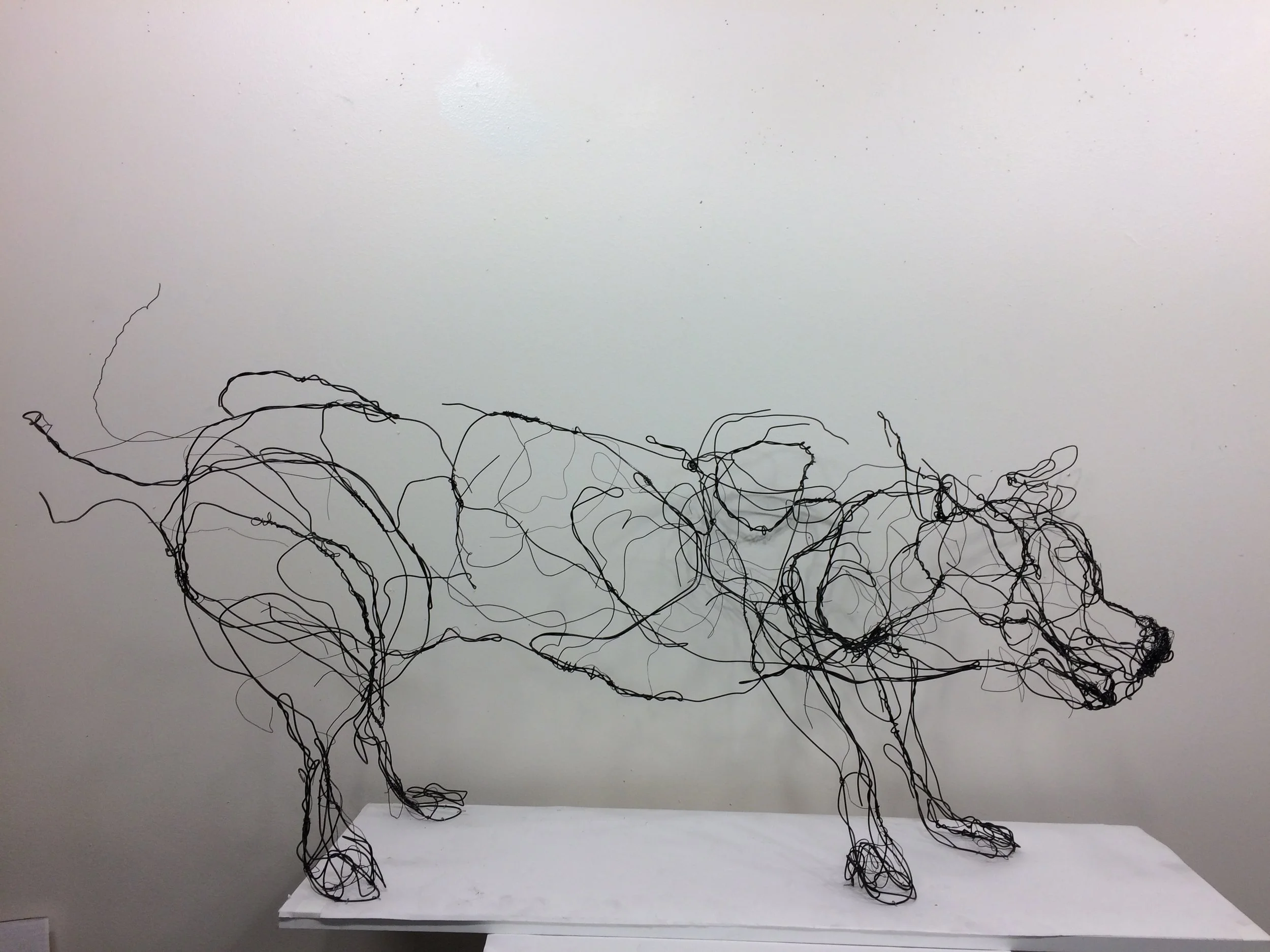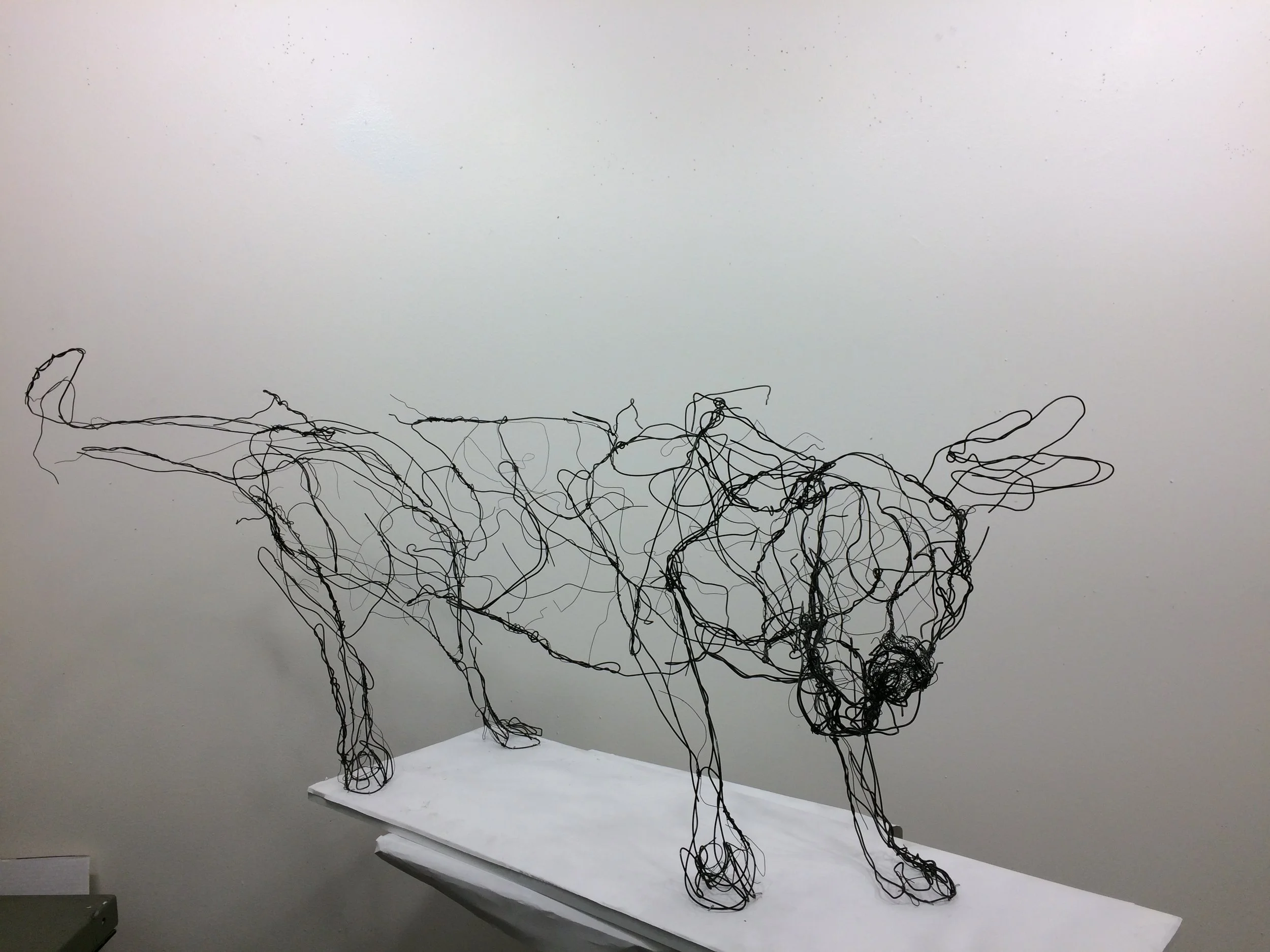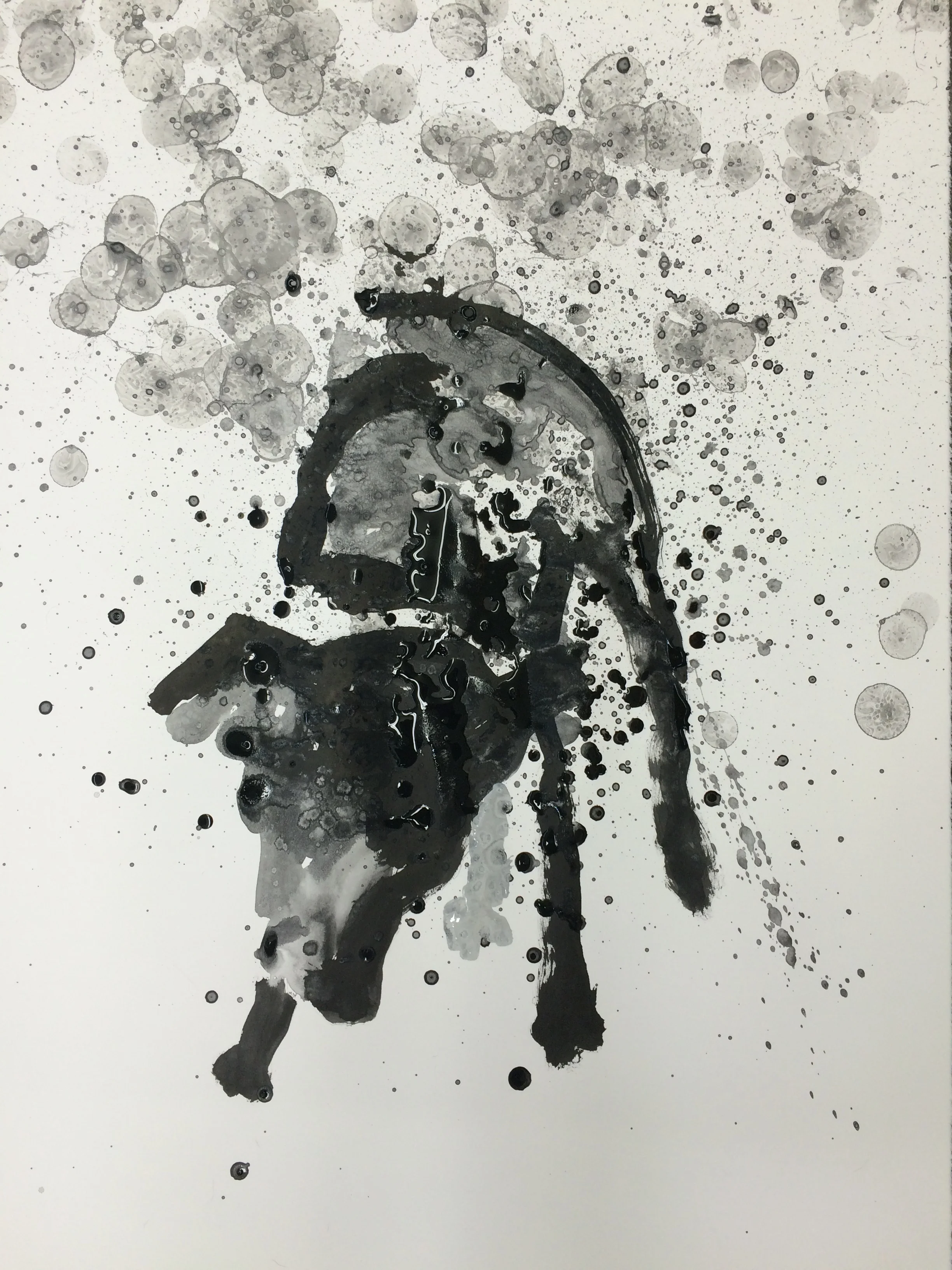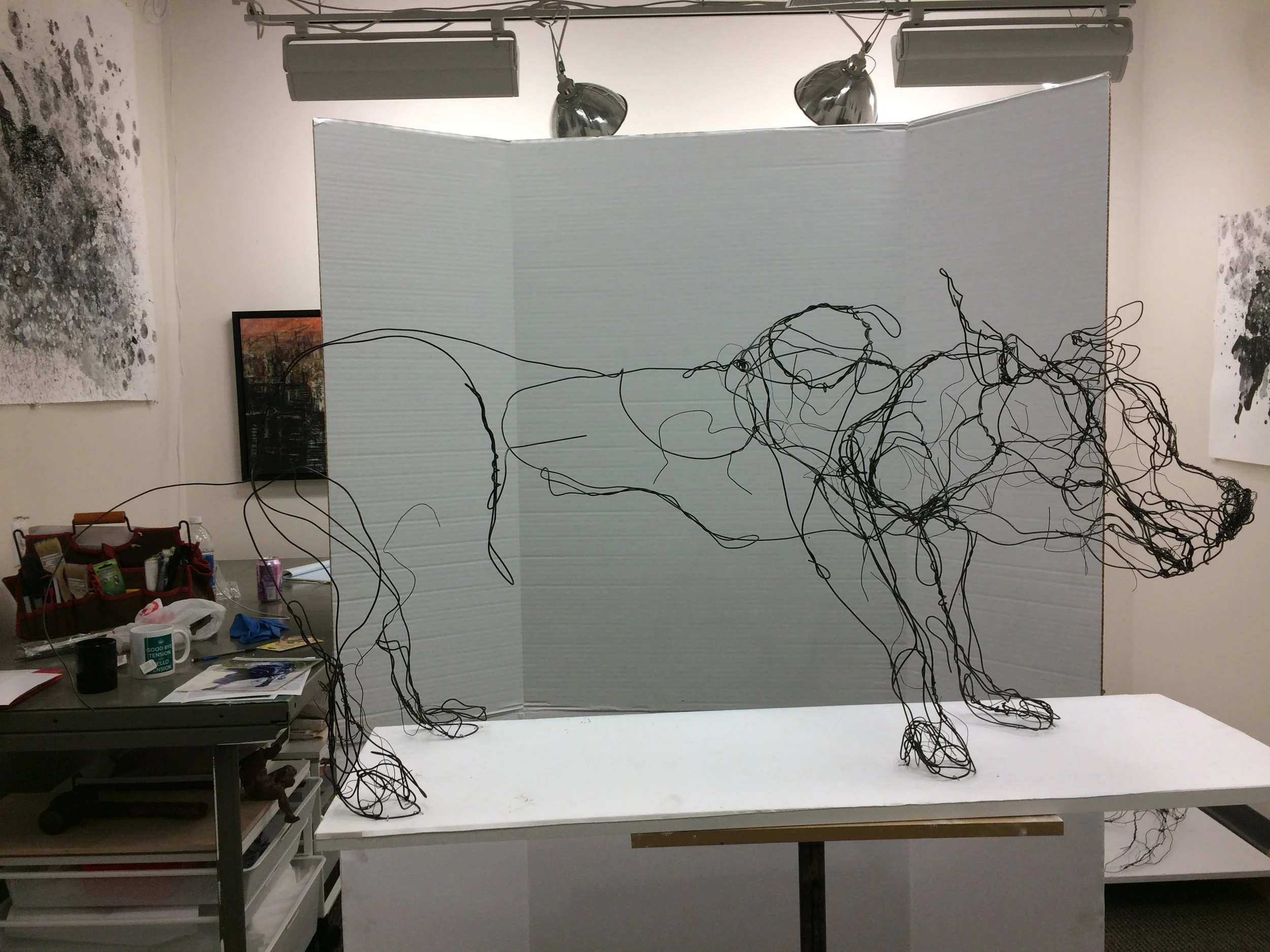 Easter of 2015 - grateful to have both kids in town we decided to go to the Buffalo Bayou Dog Park - all of us. My son Griffin took a slow mo video of our elderly Labrador Kitty. Kitty loved the dog park and would retrieve tennis balls from the pond like she was a two-year-old pup. She would consistently drop the ball at your feet and as you would bend over to pick it up shake all the water off her coat right on to all those standing near by. My son’s video inspired my “shake shake shake” series. In the drawings I used bubbles to express not only the action but the joy. The next challenge was to capture the same magical moment in 3D with wire sculptures. I have completed two sculptures and I have 3 more in my head. Then I felt the need to capture the dogs intense hyper focus on the ball before he is released to chase it down so I made "sit". "Sit " is on exhibit at MFAH Glassell studio school Interspace Gallery in the 2016 student juried show. This series of sculptures and drawings seems to continually lead to more work. I completed 6 - 50" X 60" drawings I call "fetch". The fetch pieces are more about the water as the dogs splash through water to get their balls. These pieces are all about ears and splashing. Still I feel I need 1 more piece to complete the story. The past 3+ weeks I have been working on another wire sculpture "jump". My goal is to capture that moment when time seems to freeze for a split second, the energy is calm and focused before the big splash landing in a lake. The point of view is from in the water and below the dog. Here is my drawing of "jump".