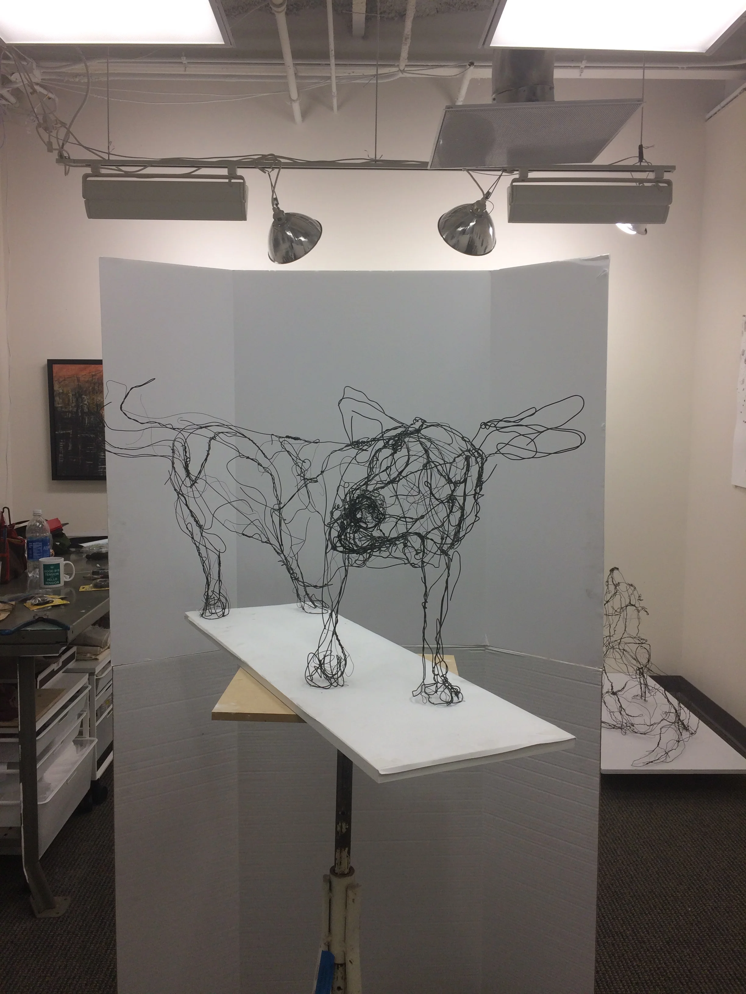 The curator, Sally Reynolds, visited my studio this past spring and selected a lenticular and a wire sculpture for a fall show in the lobby of Heritage Plaza, "known and underknown." I was particularly excited to have her visit my studio and doubly excited that she selected two pieces. I have wanted to try out a new pedestal idea, but simply have not had the room in my studio. I wanted to try putting the wire piece on a much larger pedestal, a pedestal that almost functions as part of the sculpture. Sally agreed to see what I would come up with for a new pedestal.