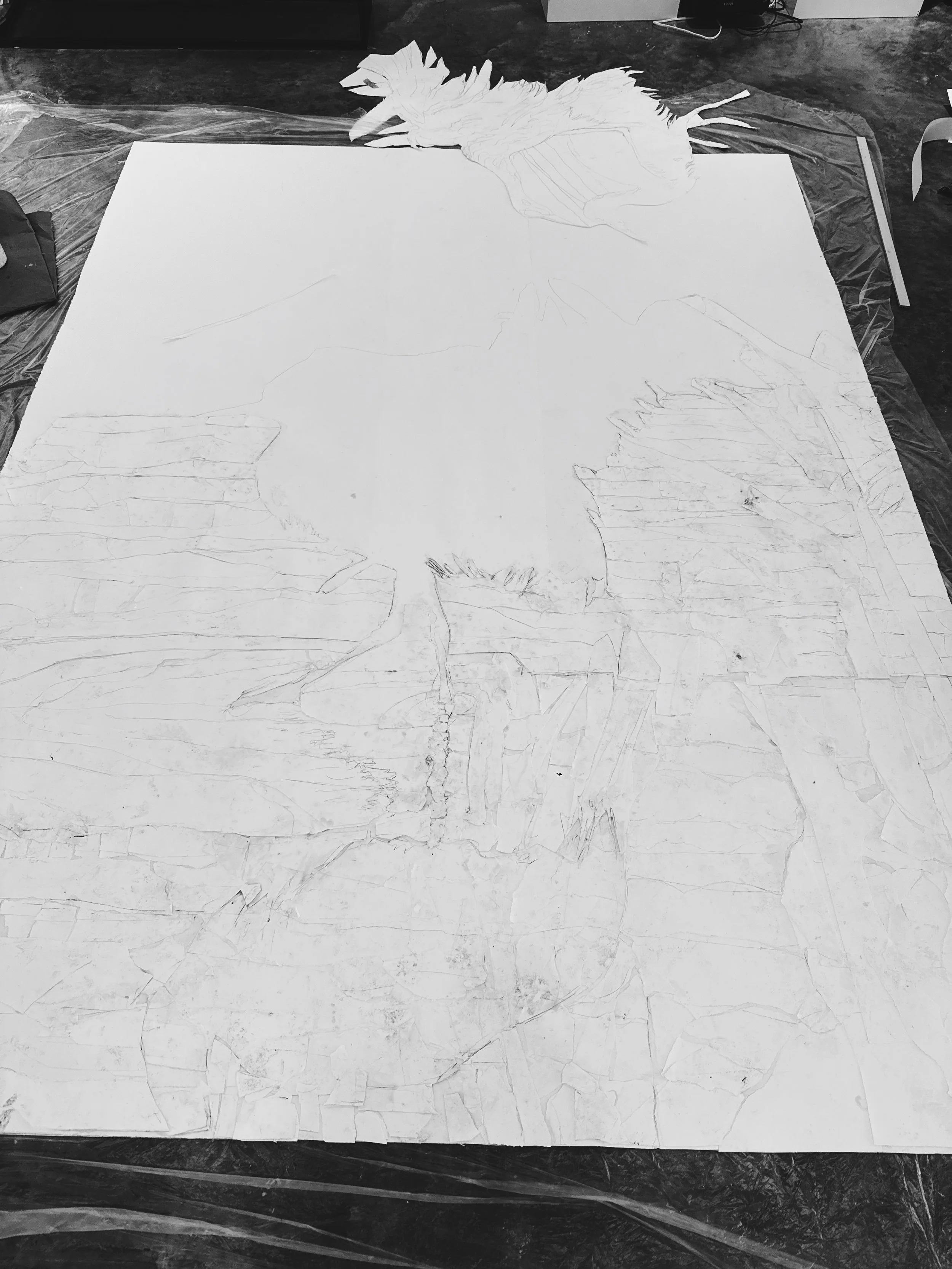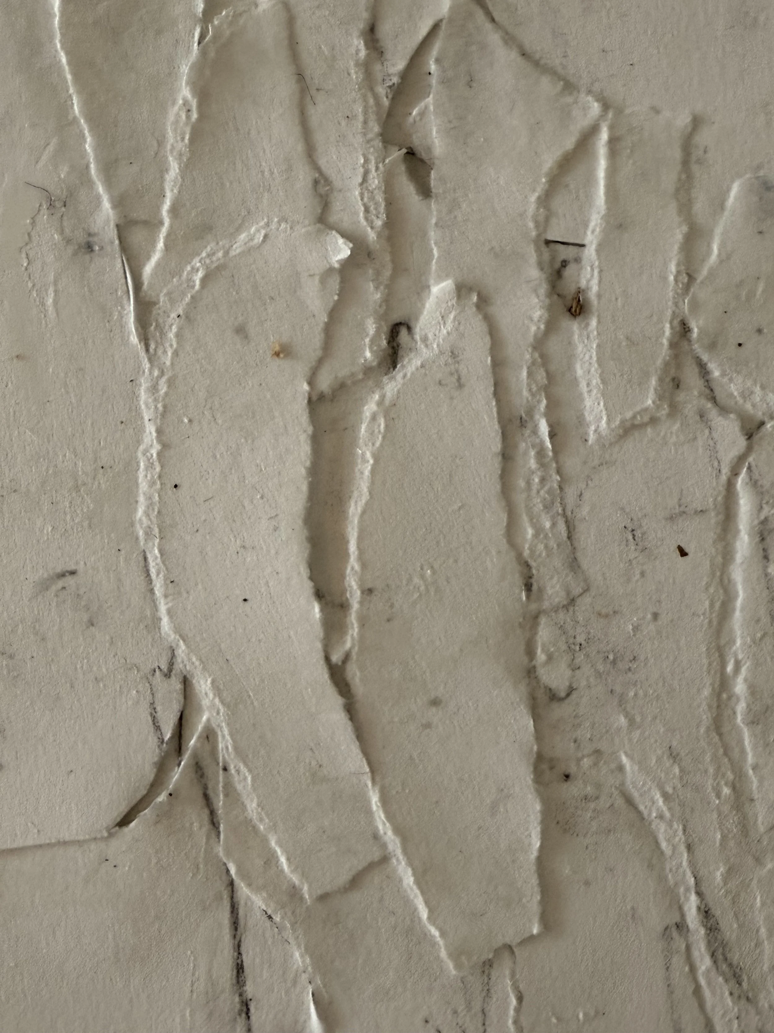 The next step involved deconstructing the drawing by tearing it into various shapes. After that, I can create a relief by reassembling these shapes on a second sheet of paper..