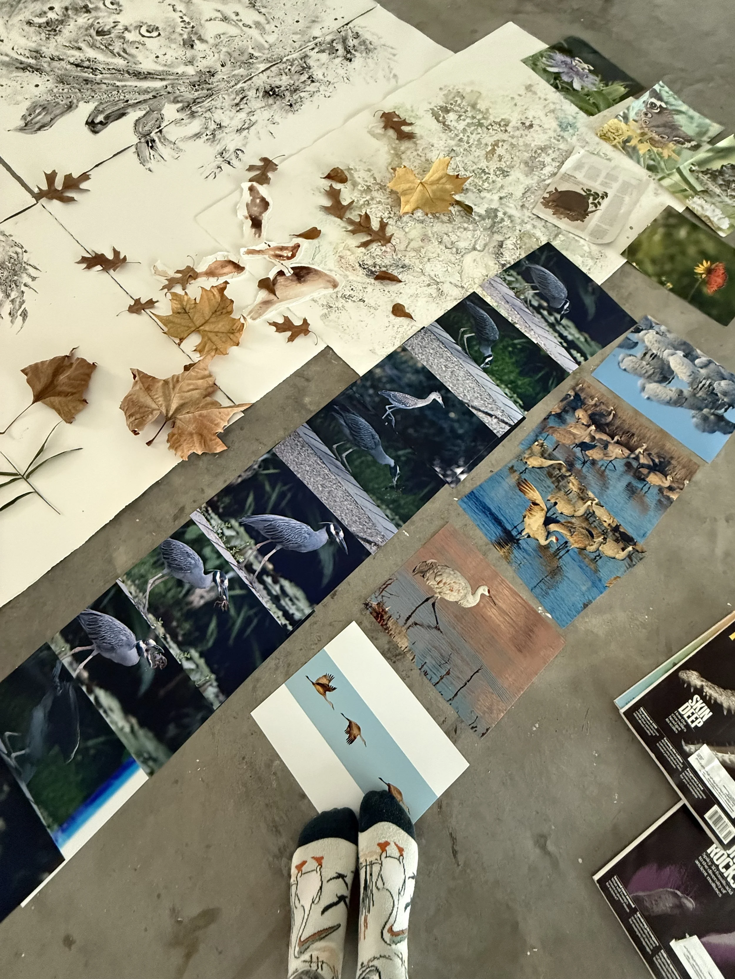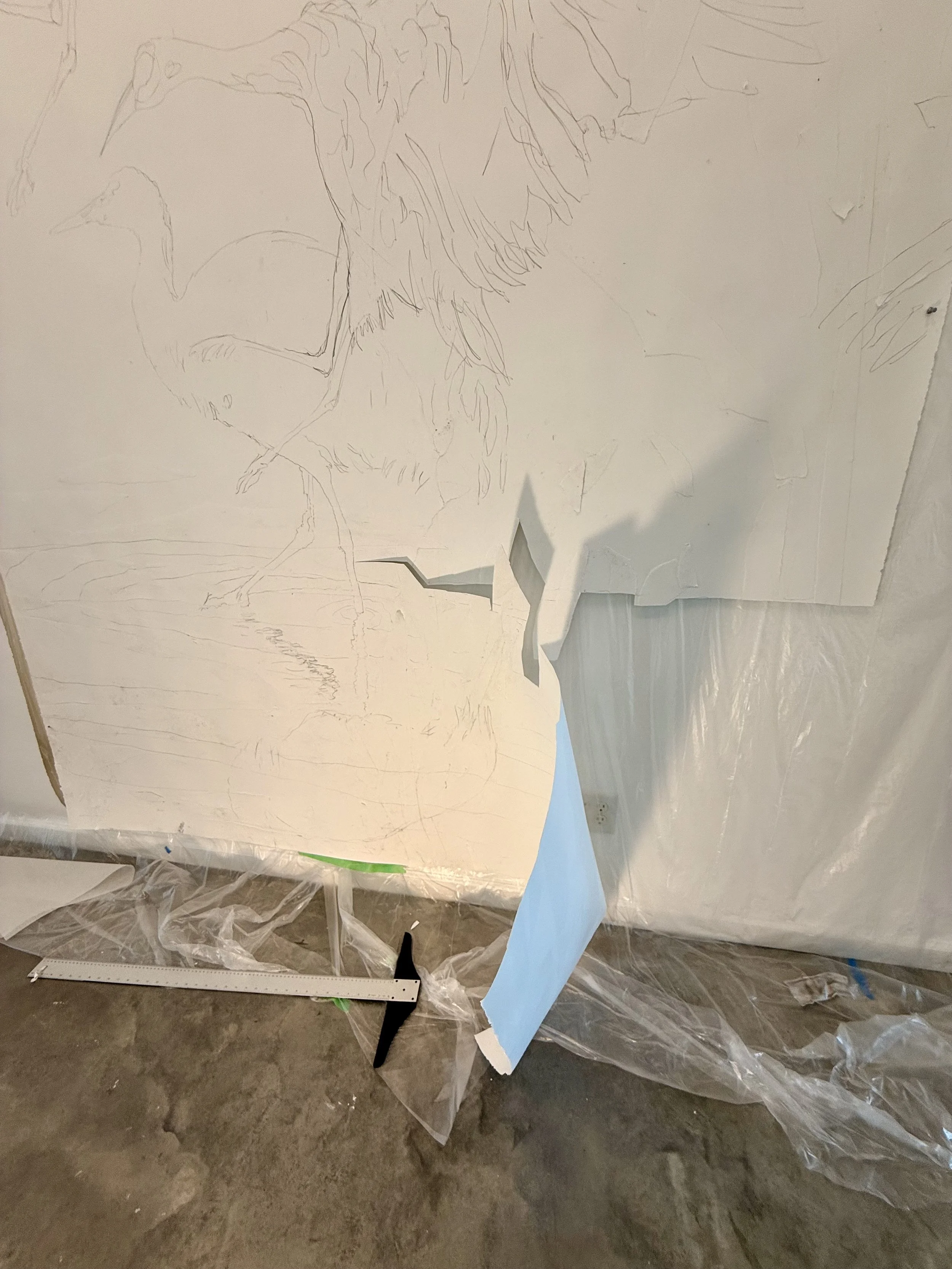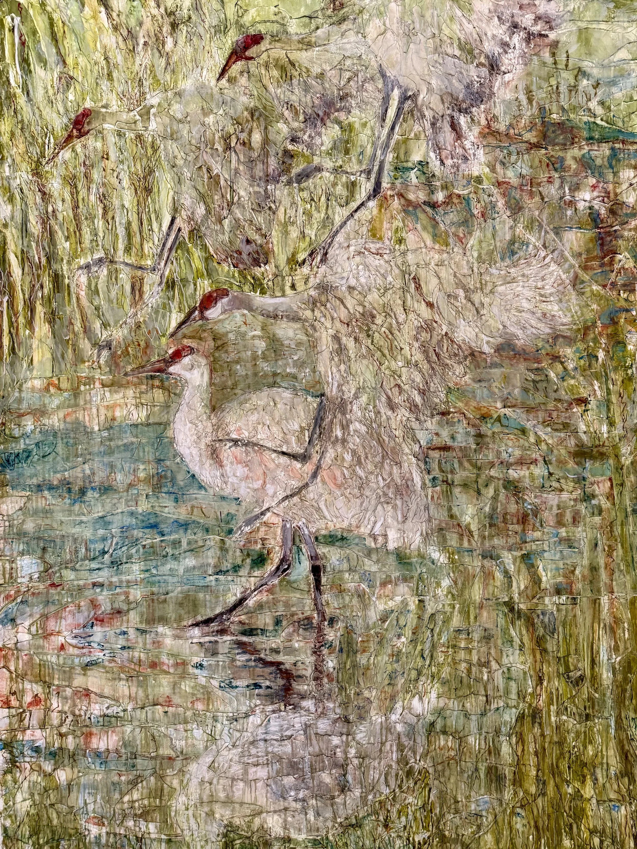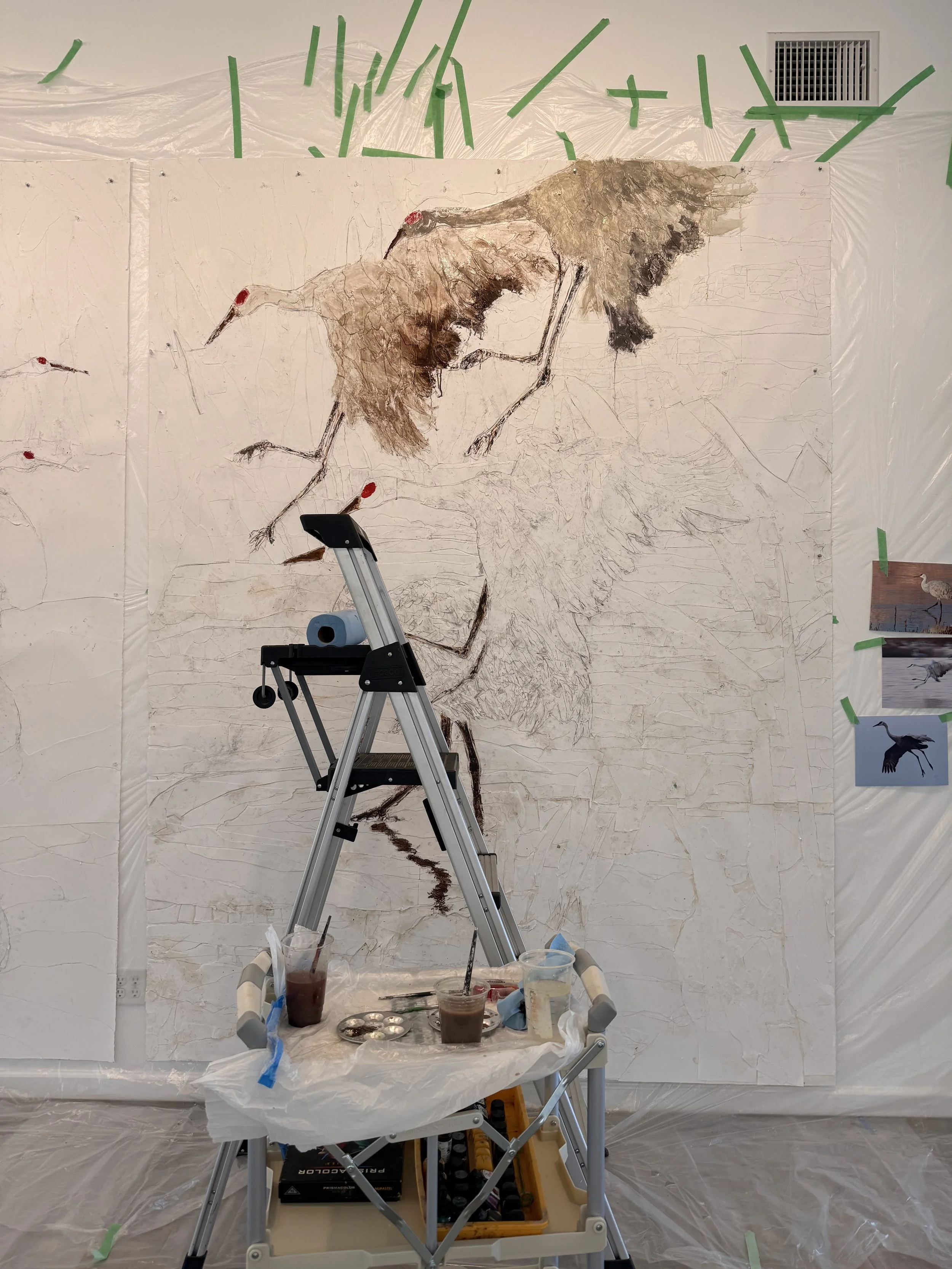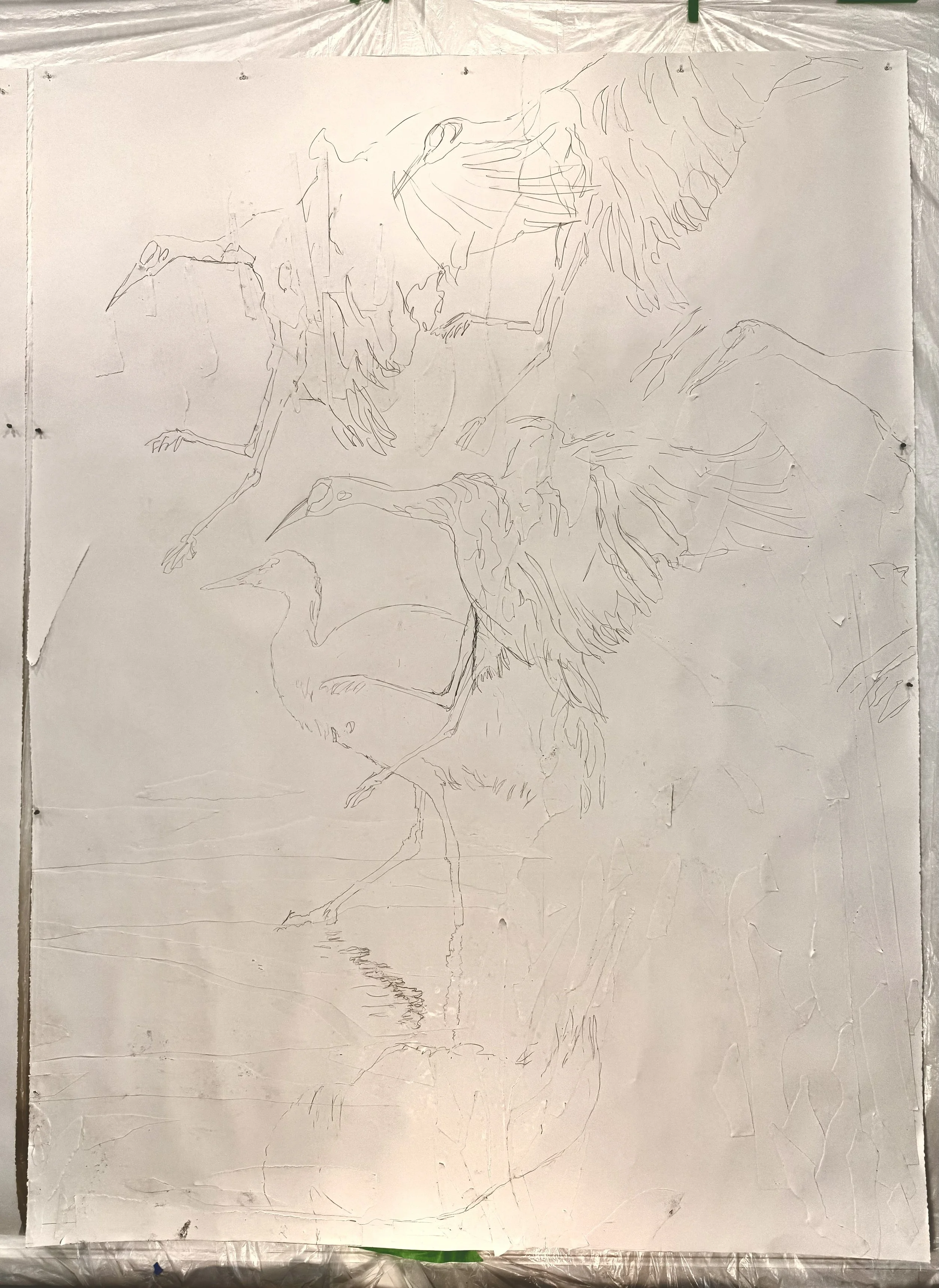 This is the final drawing of the first piece, which beautifully captures a crane landing in a wetland during twilight. The scene reflects the moment when the cranes wait for it to get dark enough that they aren't easily visible. My intention with this artwork is to encourage viewers to look closely and discover the subtle presence of the cranes in their environment.