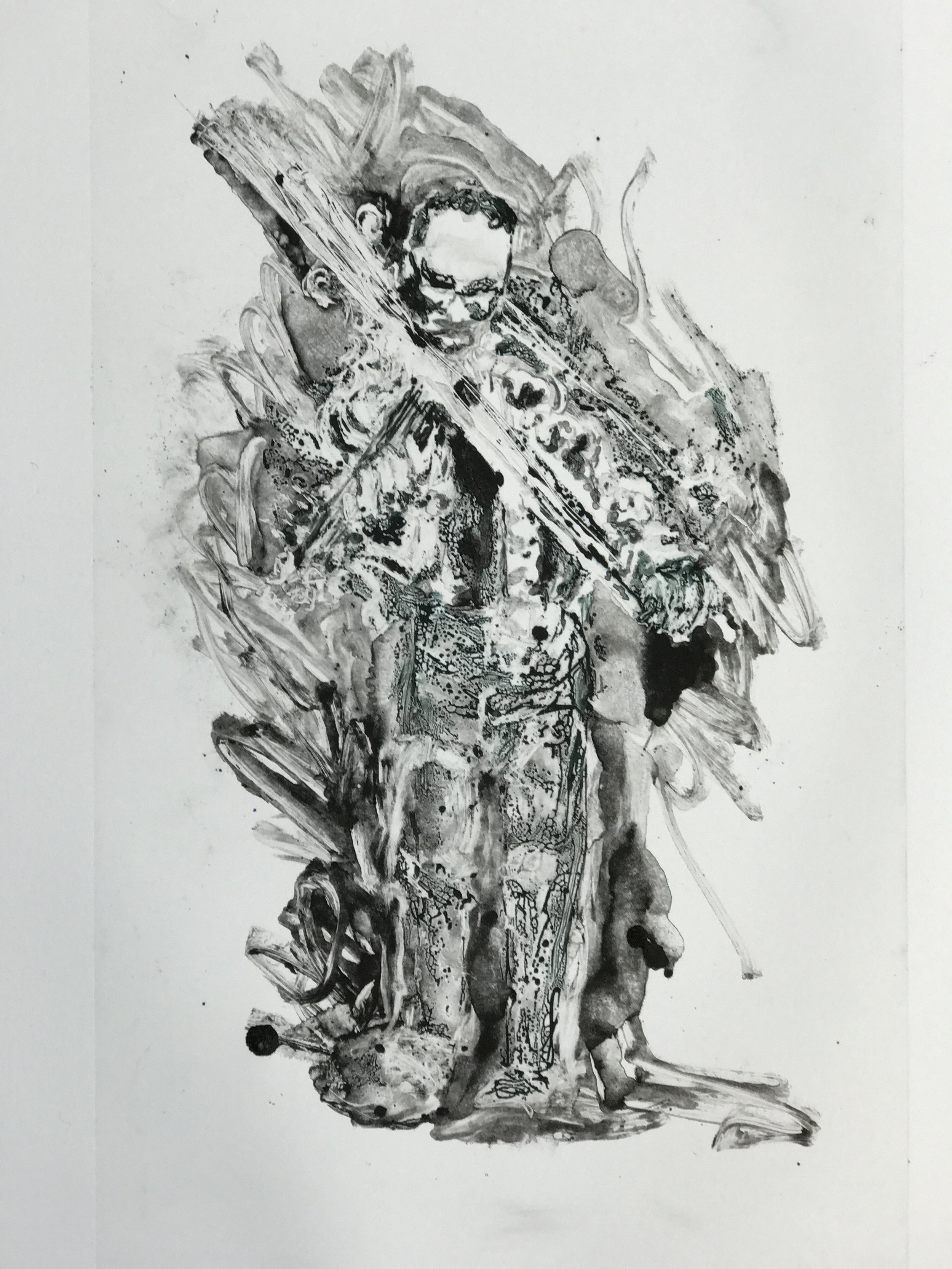 The right foot and pant leg. The pant leg starts to fold around shoe. The pant folds will be rhythmic and flow into the energy created by the music.